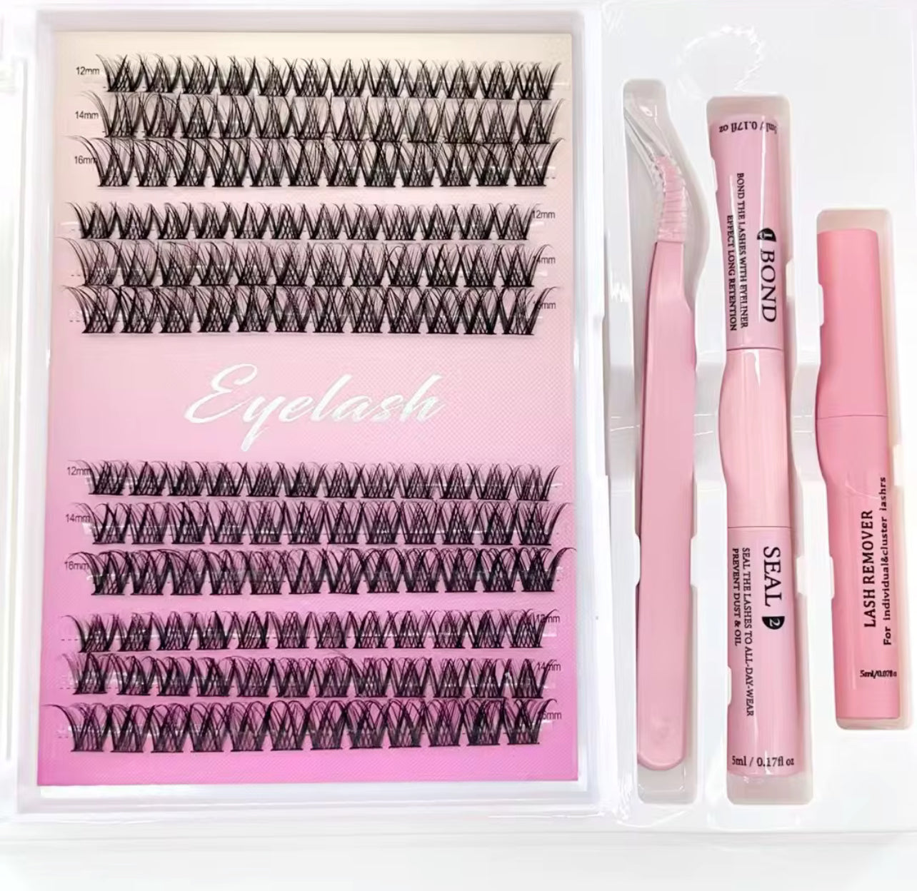 Cette boîte vient avec la colle, le fixateur, la pince et le remover✨ (pour enlever la colle) . Taille 12 à 16 mm